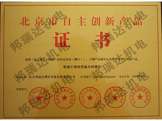 我公司研發(fā)的“煙箱片煙密度偏差檢測(cè)儀”獲得了北京市自主創(chuàng)新產(chǎn)品證書